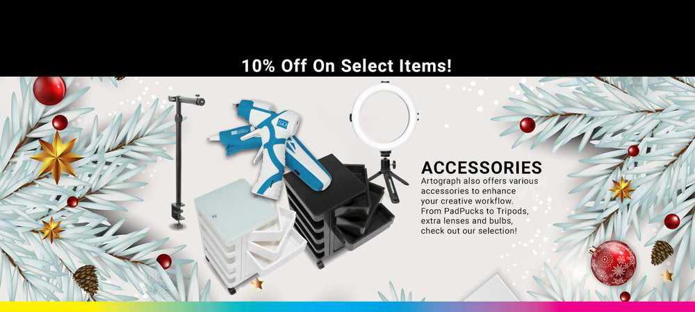 We offer a range of accessories such as Ring Lights, Tripods, Table Stands, and replacement bulbs for your Artograph products.